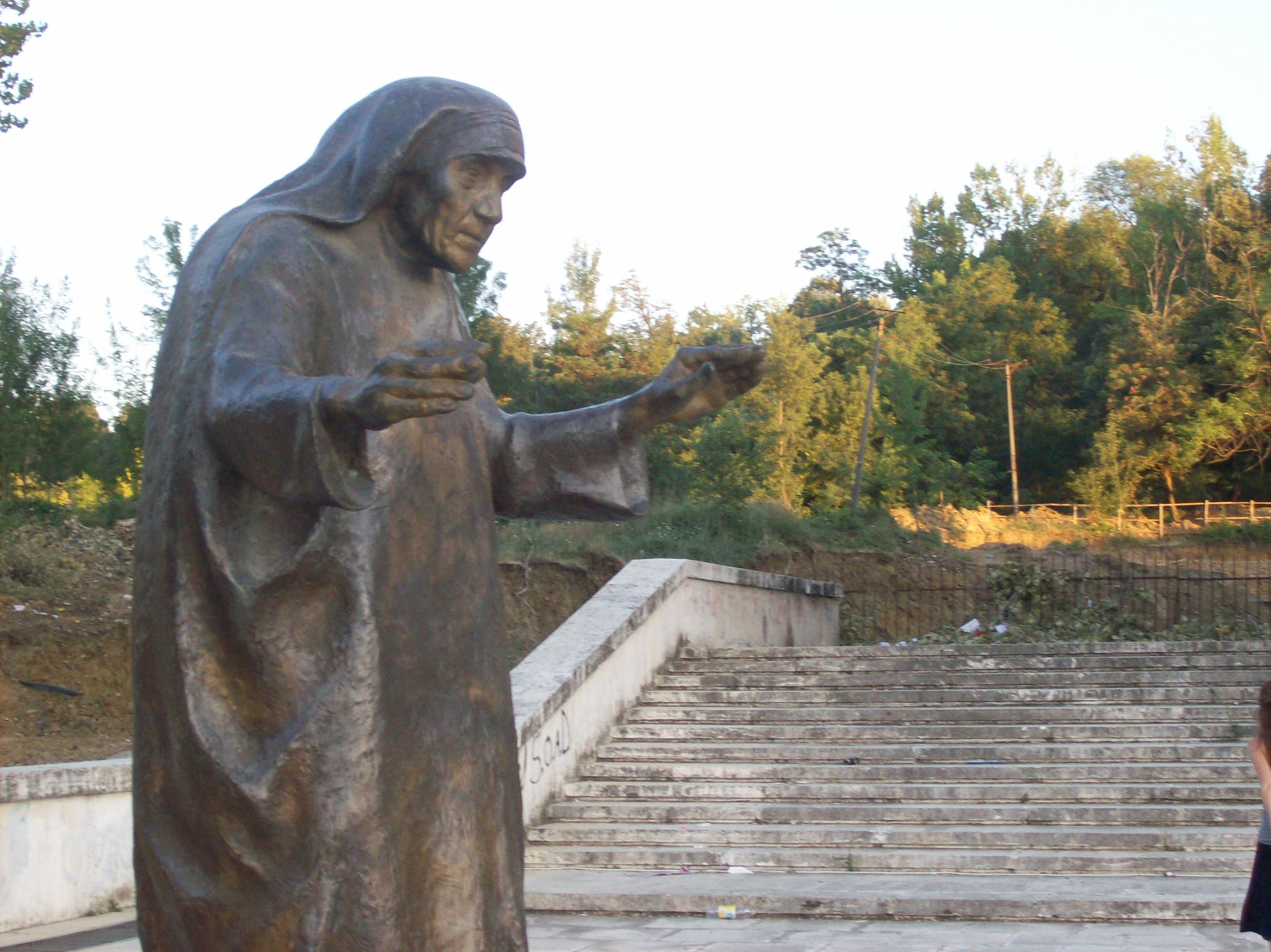 The Pope’s visit to Albania brought with it a number of changes in the public face of Tirana: I admit that I have followed these urban restorations (mostly centered, as far as I have seen, on Mother Teresa Square) only casually in the media, and have insufficiently pondered their full import in conjunction with Edi Rama’s disturbing rhetoric, with its combination of fiery neoliberal Europe-adoration and barely-concealed orientalism. In the midst of many other discussions about the significance of the Pope’s visit, I nearly forgot an event that appeared in the news in early September, and then seemed to pass into oblivion: the removal of the two Mother Teresa statues in Mother Teresa Square (by Thoma Thomai) and in the Rinas Airport (by Luan Mulliqi) for cleaning, restoration, and eventual replacement in preparation for the Pope’s visit. Ultimately, the plan was for the two statues to switch places—the Thomai going to the airport and the Mulliqi (possibly) coming to the square—but I have not seen any evidence that this was completed on schedule. In fact, I would welcome information from those who were in Albania for the Pope’s visit (or who have simply seen news broadcasts I have not seen) about whether or not the statues—one or both—have found their new homes.
