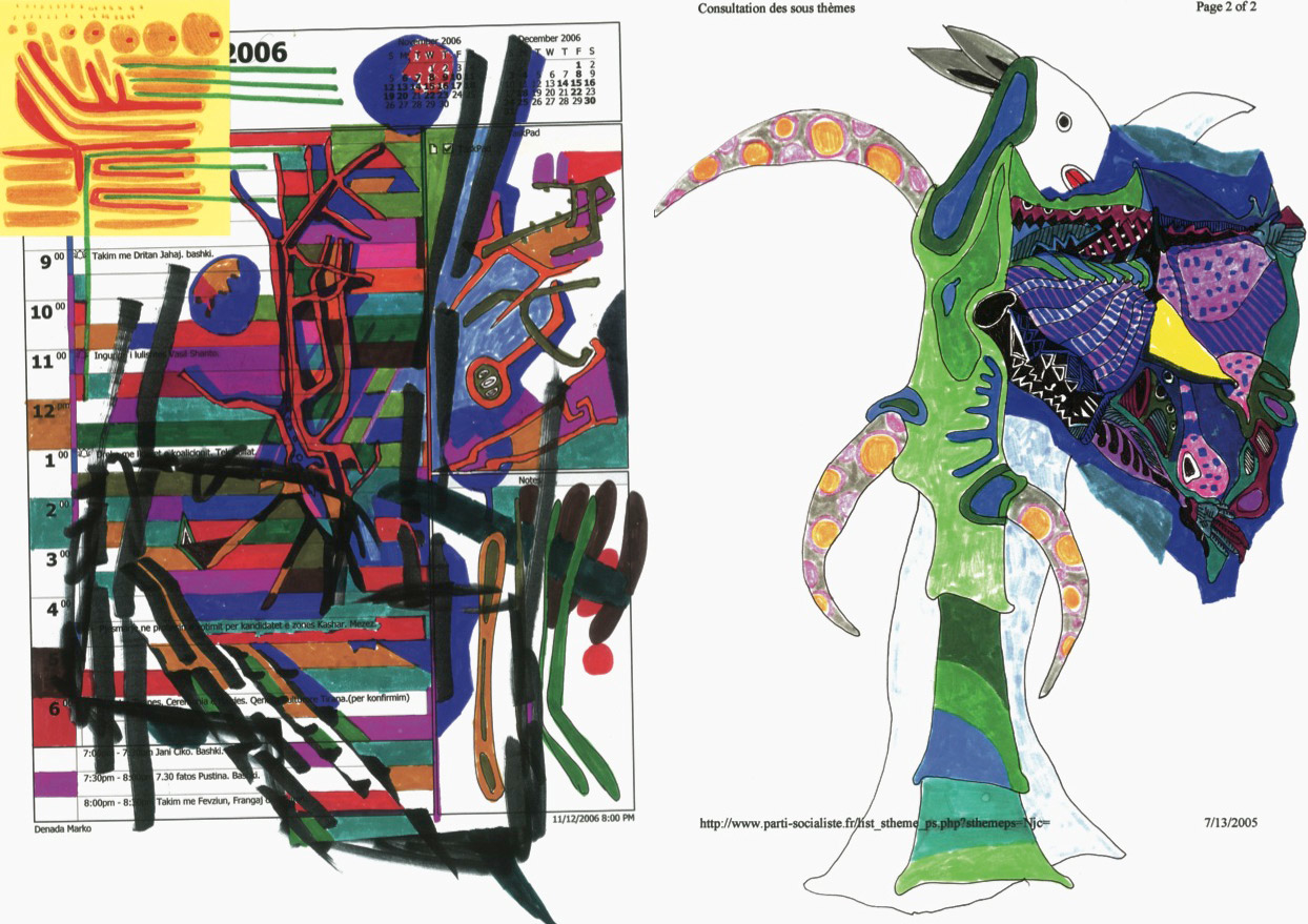 This anecdote reveals several aspects of Rama’s politico-artisthood. His drawing and doodling is a compulsion. He does it “all the time,” and without it, he is not himself. Drawing here is a necessary supplement to listening, as he cannot “concentrate” without having a pen in his hand, sketching out the conversation. There is thus a direct mediation between the conversation partner, who puts forth his “problem,” and “drawing the picture” – a mediation that is thoughtless and effortless. Because of the position of this morality tale, which is at the same type an example of his political ethos and a warning not to disrupt it, just after the introduction of the canvas of politics, this image suddenly becomes much more concrete. While engaging in politics, discussing the issues of the country, studies for the larger canvas are doodled on his agenda and memos. Continuous artistic production therefore slowly contaminates and erases the minutiae of administrative language. Contrary to the slow trickle-down of bureaucracy, Rama authoritatively transforms the concerns of the citizen immediately and without interruption into the bigger, political picture. Doodling here becomes a sovereign gesture that cancels out bureaucratic and administrative procedure. It is therefore not difficult to imagine an absurdist scene in which dozens of government officials are peering over Rama’s colored notes, interpreting the colors, shapes, and forms of the doodles as if they were divining a sheep’s liver or the drivel on the bottom of a coffee cup.