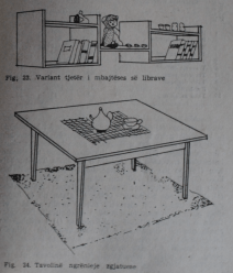 Guxholli (also the author of a book on famous artists, Mjeshtër të Pikturës [1990]) does not provide a long history of the development of interior furnishings, but instead focuses on practical matters. He lays out the prevailing standardized models of apartments in socialist Albania, and suggests how different pieces of furniture may be grouped and distributed throughout the rooms of apartments. He considers the emotional impact each space should have: “the living room should create the feeling of comfort and warmth, the guest room [dhoma e mysafirëve] that of welcome, the kitchen that of cleanliness, the bedroom the feeling of calm, and so forth” (p. 14).