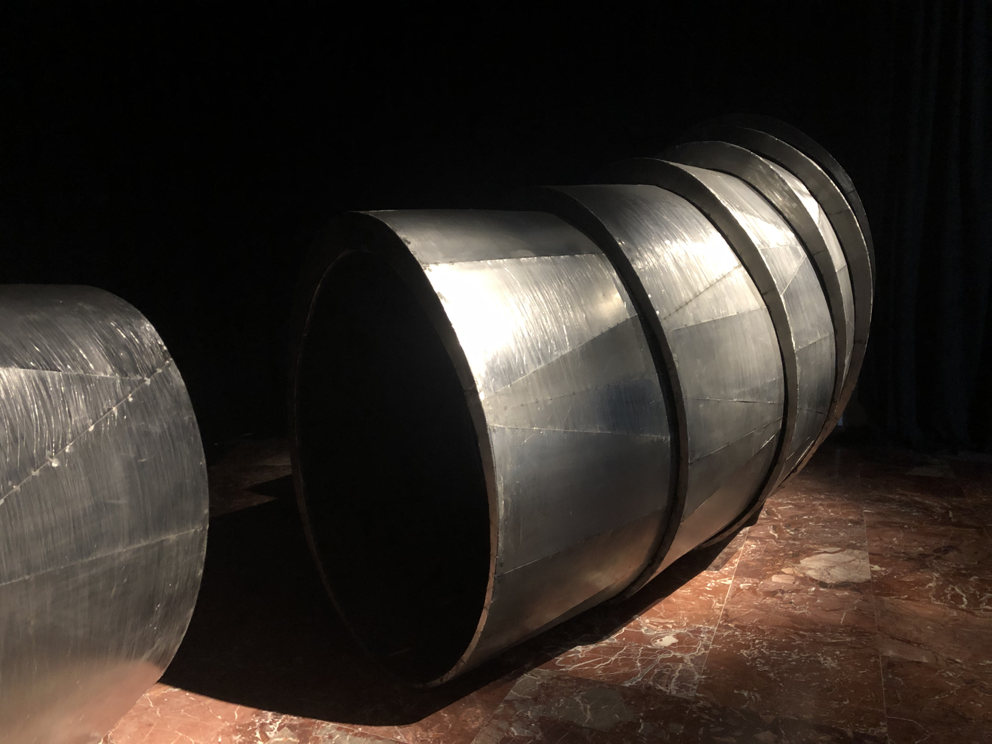 If The Revolution… approaches the question of living together through the lens of the city (and the effort to imagine its present and future development), Leviathan instead approaches this question through the lens of the body politic. In this particular case, the embodiment—and consolidation—of political power is dually represented in both the exhibition space and the theme of the exhibition itself. Leviathan is a solo exhibition of the work of sculptor Ergys Krisiko (the son of sculptor Kristo Krisiko) presented in the Center for Openness and Dialogue (COD), a multipurpose exhibition space opened by artist-politician Edi Rama in 2015, inside the first floor of the Prime Ministerial building. The exhibition presents three distinct large-scale sculptural installations, one of which is installed outside the entrance to the COD and two of which reside inside it. One of these latter groupings—two massive hollow segments depicting the tail of an immense sea creature—is installed in the main entrance hall of the COD, while the second is a set of gargantuan, lens-shaped metal forms that take up most of the space inside the COD’s side gallery (Salla “Tako Artistin”), located immediately off the entrance hallway.