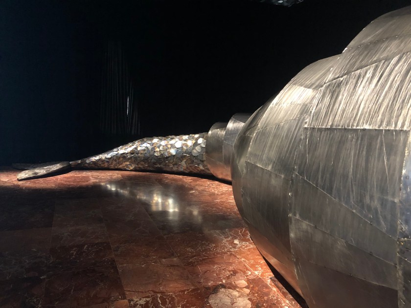As a visitor enters the COD, they pass through a metal detector (a stark reminder that one is not simply entering a gallery), and immediately confront a wall of black curtains. Moving to the right, the visitor passes behind the curtains and confronts the massive tail of a fish, made of metal and split into two sections. One section terminates in the tail fin, while the other section disappears into the wall at right. The fact that the two are split apart allows a viewer to pass between them and look into the darkness of their hollow interiors. The second section, the one that disappears into the wall, is nearly as tall as a person, and once feels that one could crawl inside. In fact, from photographs taken at the opening, this half of the Leviathan’s body held a single candle illuminating a quotation from Hobbes: “As a draft-animal is yoked in a wagon, even so the spirit is yoked in this body.” On my two visits to the exhibition, however, both sections remained dark—there was no candle, and the quotation was not visible. While this quote certainly helps frame the exhibition’s emphasis on the material shell of the COD—reflected through the material shell of the metal sea beast laid out within it—I am not convinced it is necessary. It makes the work a little too literal, and in my mind distracts from the overwhelming effect of the darkness within both halves of the Leviathan’s tail, which in turn creates the impression of a tunnel that one could enter into.
