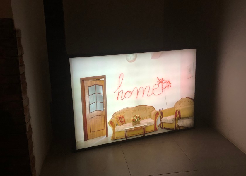 As the visitor descents the stairs and enters the exhibition space, they first encounter a room containing Ledia Konstandini’s Untitled (the cage balcony), Lori Lako’s On Fog, Blur, and Other Uncertainties, Alketa Ramaj’s Rritesja 1 (carrying structures), and Stefano Romano’s Unfinished Archive. To the right as one enters, in a sort of narrow dead-end hallway that also functions as its own room, is Remijon Pronja’s Home. These works set the stage for the exhibition’s encounter with the city, an encounter that moves between nostalgia, suspicion, kitsch, and documentation, constituting a series of earnest efforts to answer the question: how can we know the city, and our place within it?