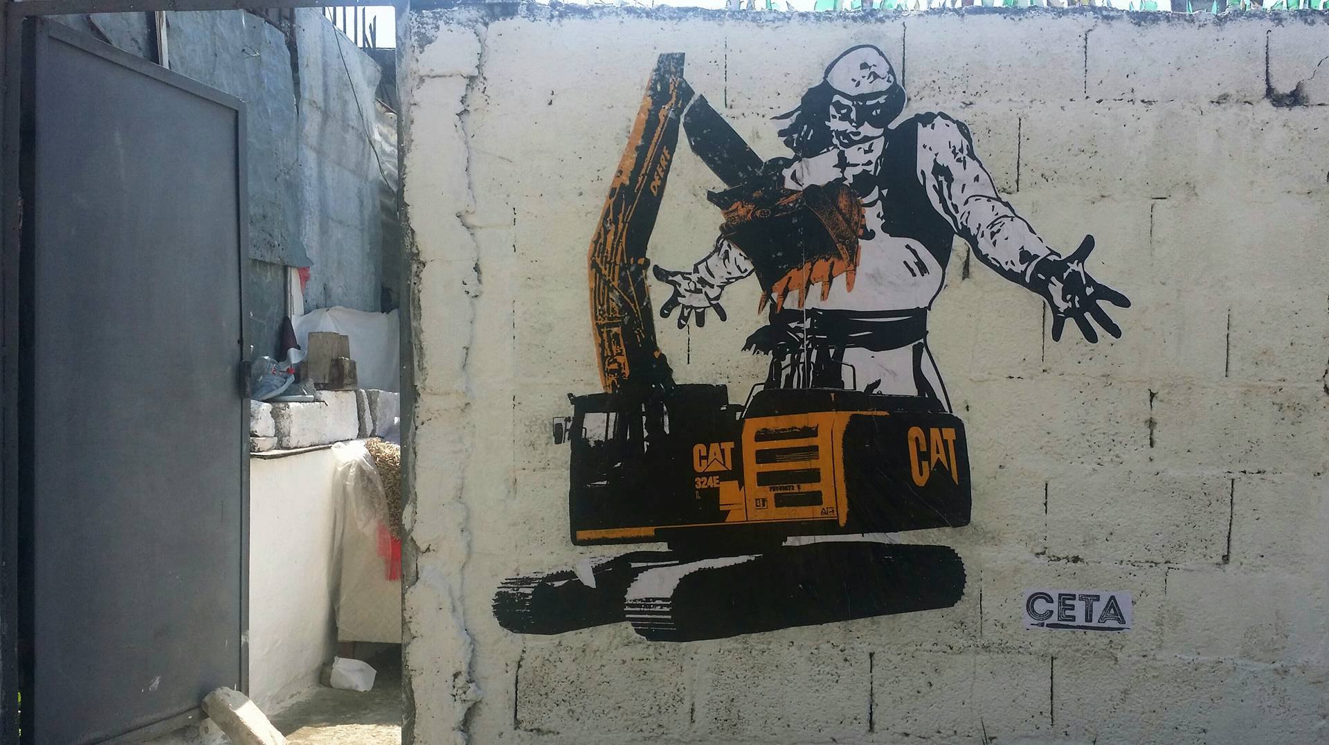 Çeta has created a new sticker, in which Mic Sokoli places himself boldly before the excavator of ‘rehabilitation,’ exposing his chest to its ripping teeth. With this work, Çeta expresses their solidarity with the families living in this zone, and with every individual or collective who finds themselves similarly oppressed and uprooted by the greedy machinery of the politics of the neoliberal system. This time, the ‘epic’ is dedicated to the excavator, for that is the glorious story that government propaganda has woven around this machine. Against it, the epic we lack, the epic of Mic Sokolit, must and will rise and be told!
