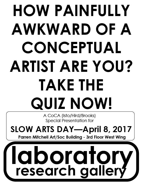 How Painfully Awkward of a Conceptual Artist Are You? Take the Quiz Now! This project was co-curated with the director of the Laboratory Gallery, CW Brooks. It was organized on the occasion of Slow Art Day, April 8, 2017. Share this: Click to share on X (Opens in new window) X Click to share on Facebook (Opens in new window) Facebook Like Loading...