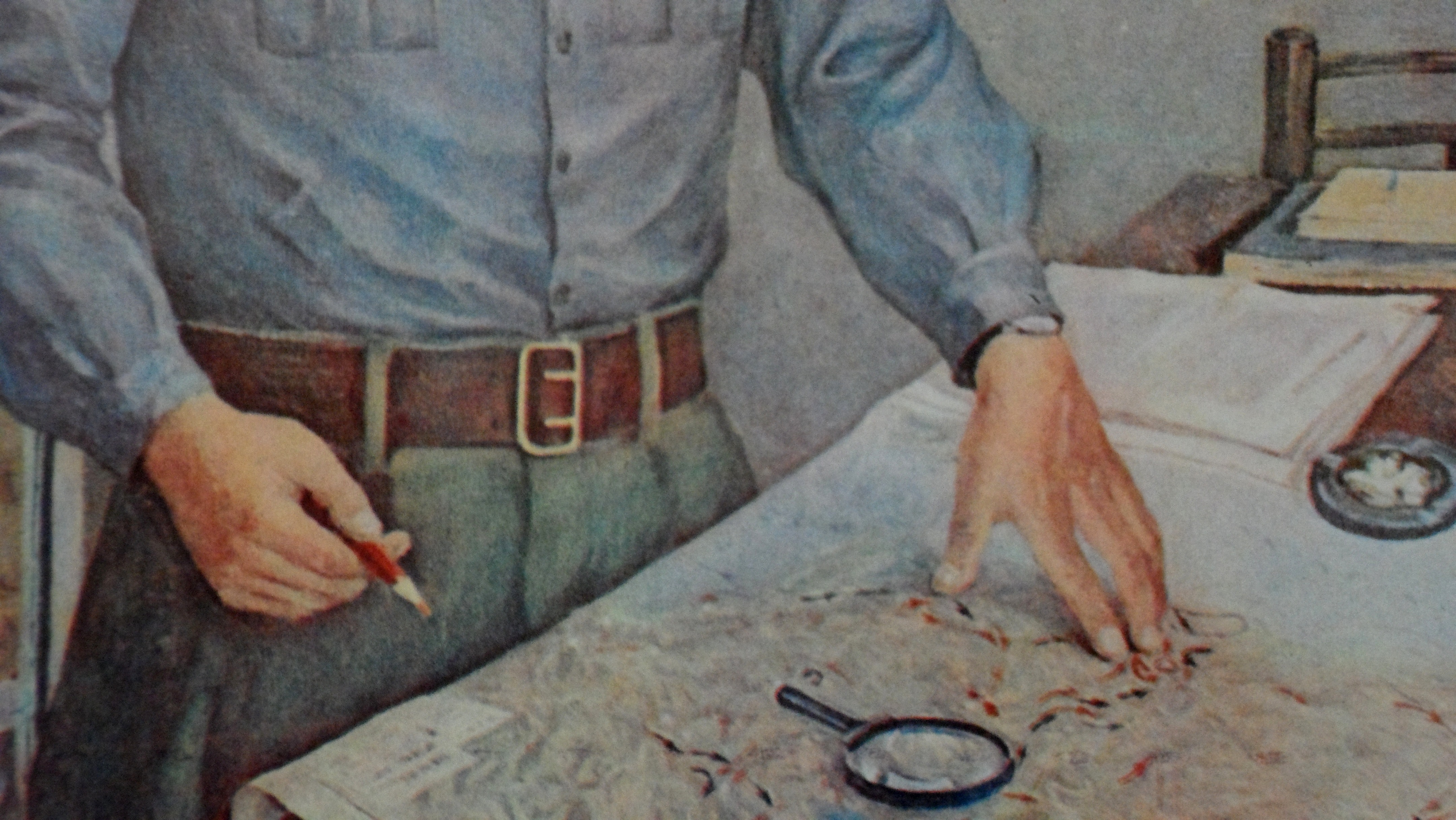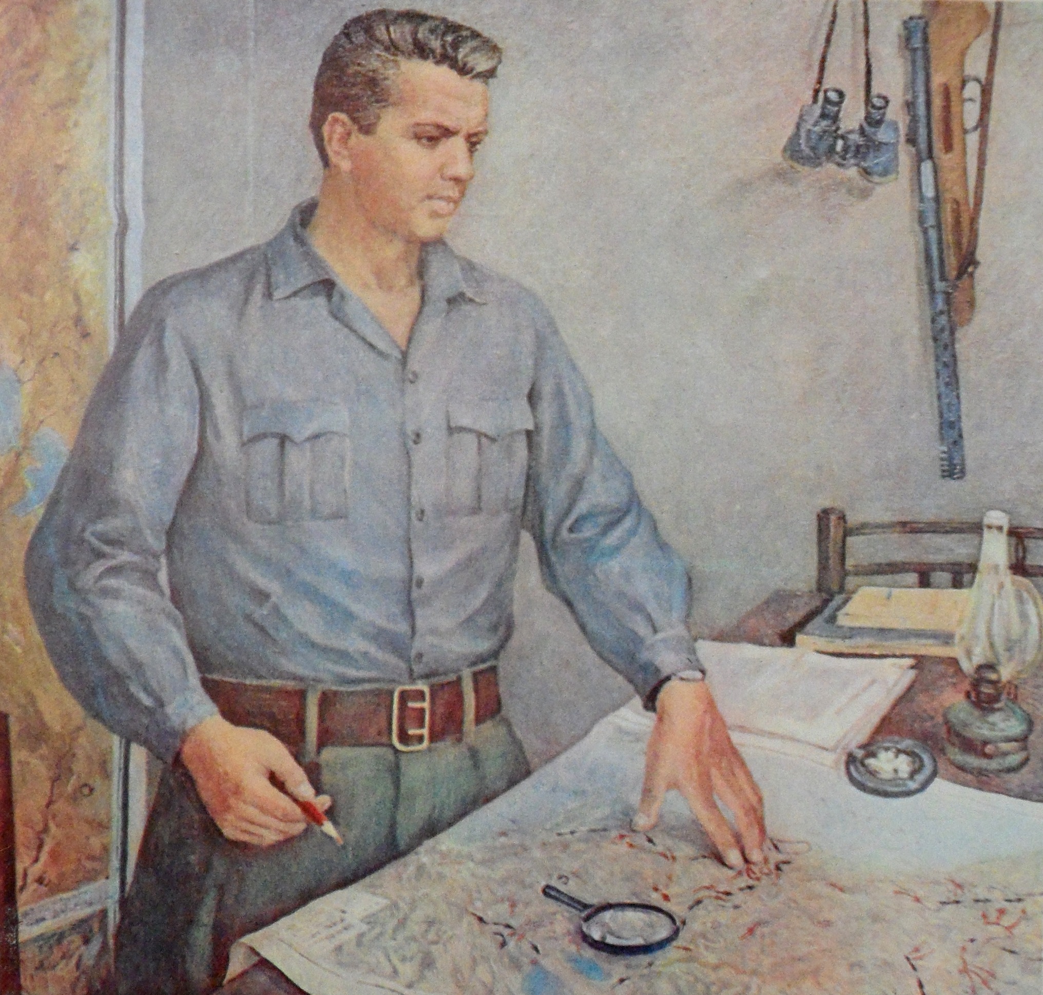 This is, undoubtedly, the standard for images of Hoxha produced during his regime: a brief survey of portraits and history paintings by Vilson Kilica, Sali Shijaku, Shaban Hysa, Kujtim Buza, and others will confirm that Hoxha never casts a shadow. Or doesn’t he? The first thing to be said, an issue I think is extremely important but which I do not wish to dwell upon here, is that figures in socialist realist paintings more often than not do not cast shadows in general.[2] Thus, Hoxha is part of a general rule. However, it is more fruitful to consider the counterexamples that prove this rule, one of which is Spiro Kristo’s Shoku Enver Hoxha Gjatë Luftës Nacionalçlirimtare (1974). Here, we see Hoxha as a young commander,[3] presumably in the headquarters of the resistance: he stands at left, a map at his back and a table before him, where his left hand rests on yet another map. A rifle and binoculars hang on the grey wall to his left, and documents, a lamp, an ashtray, and notebooks clutter the surface of the table. The lighting here is once again quite vague, but the source clearly comes from the upper right side of the canvas, high over both our and Hoxha’s heads (not at all from the lamp at the desk). The map on the table disappears out of the frame at lower right, while its bottom edge is folded over the edge of the table against which Hoxha stands. A magnifying glass rests on the map, and black and red arrows mark the movements of the occupiers and the resistance. Hoxha holds a red pencil in his right hand, lax, while his left is firmly planted on the map, at a swirling cluster of arrows (presumably near Tirana). And there is the shadow.